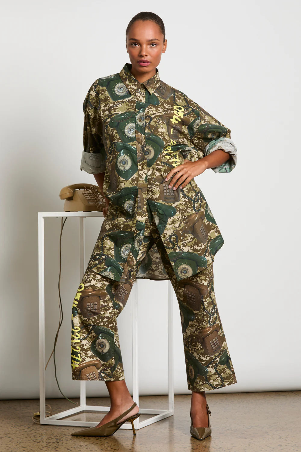 Classic meets quirky in The Cat’s Meow Shirt. Reimagined in the bold Camo Telephones print, this oversized shirt blends utility-inspired camo tones with retro telephone graphics for a playful yet polished statement. Featuring timeless tailoring with a button-front, crisp collar, and curved hem, it’s perfect for effortless layering or standout styling.