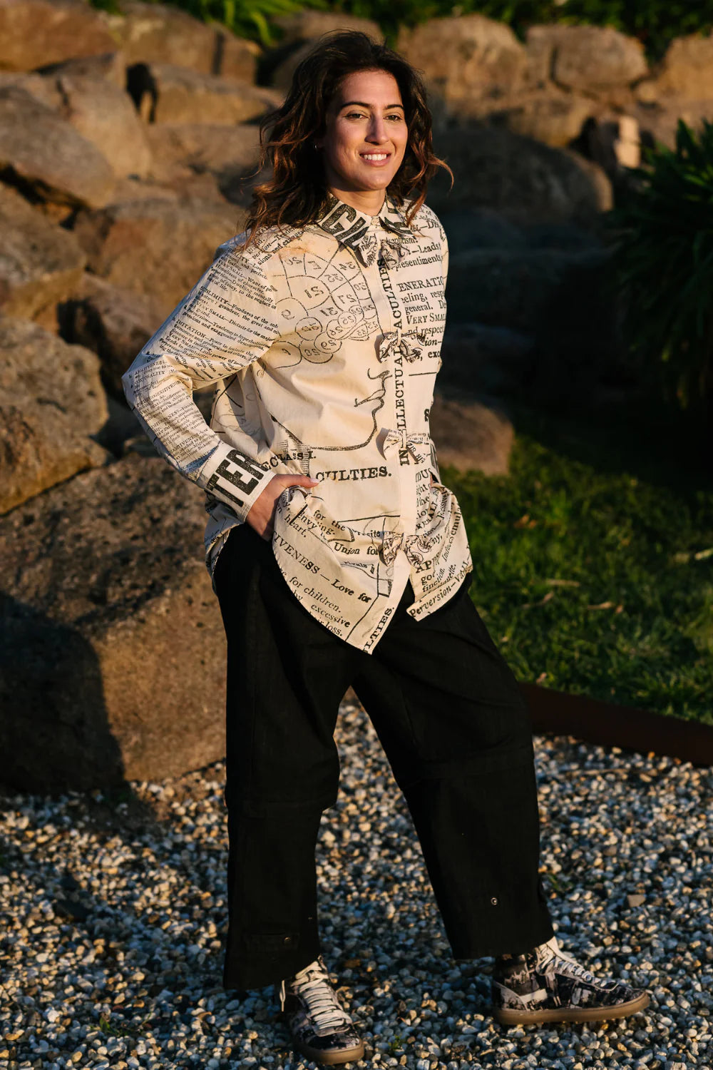 Make a literary statement; the Notebook Shirt by Circular x M.A. Dainty in Phrenology blends classic typography with modern design. Crafted in a soft, breathable fabric, this longline button-up features an all-over vintage dictionary-inspired print in timeless black on a warm ivory base. A structured collar and concealed placket give a clean, polished silhouette, while delicate tie-front details add an unexpected, feminine touch. The relaxed cut ensures effortless comfort and versatility, perfect for layering over tailored pants or styling loose for a contemporary edge. With its artful text layout, oversized typography, and thoughtful detailing, this shirt is a true conversation piece for creative workdays or elevated weekend wear.