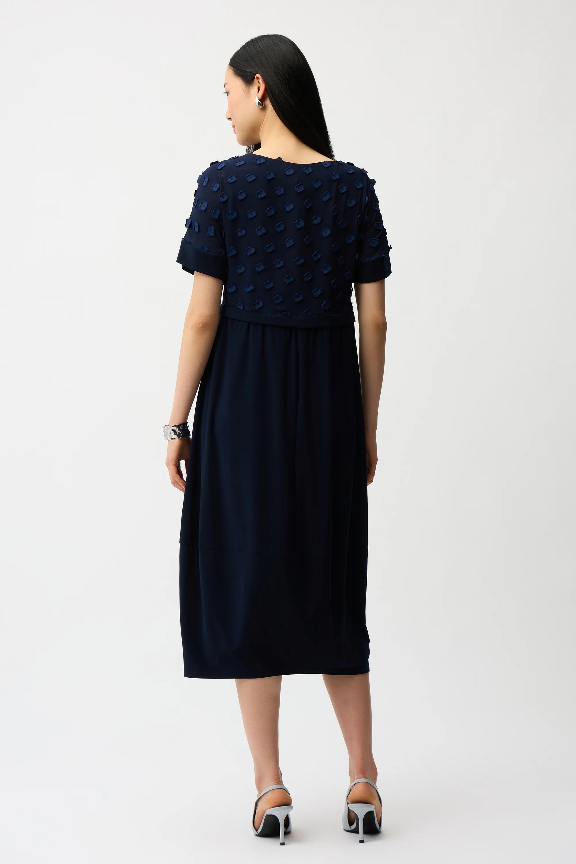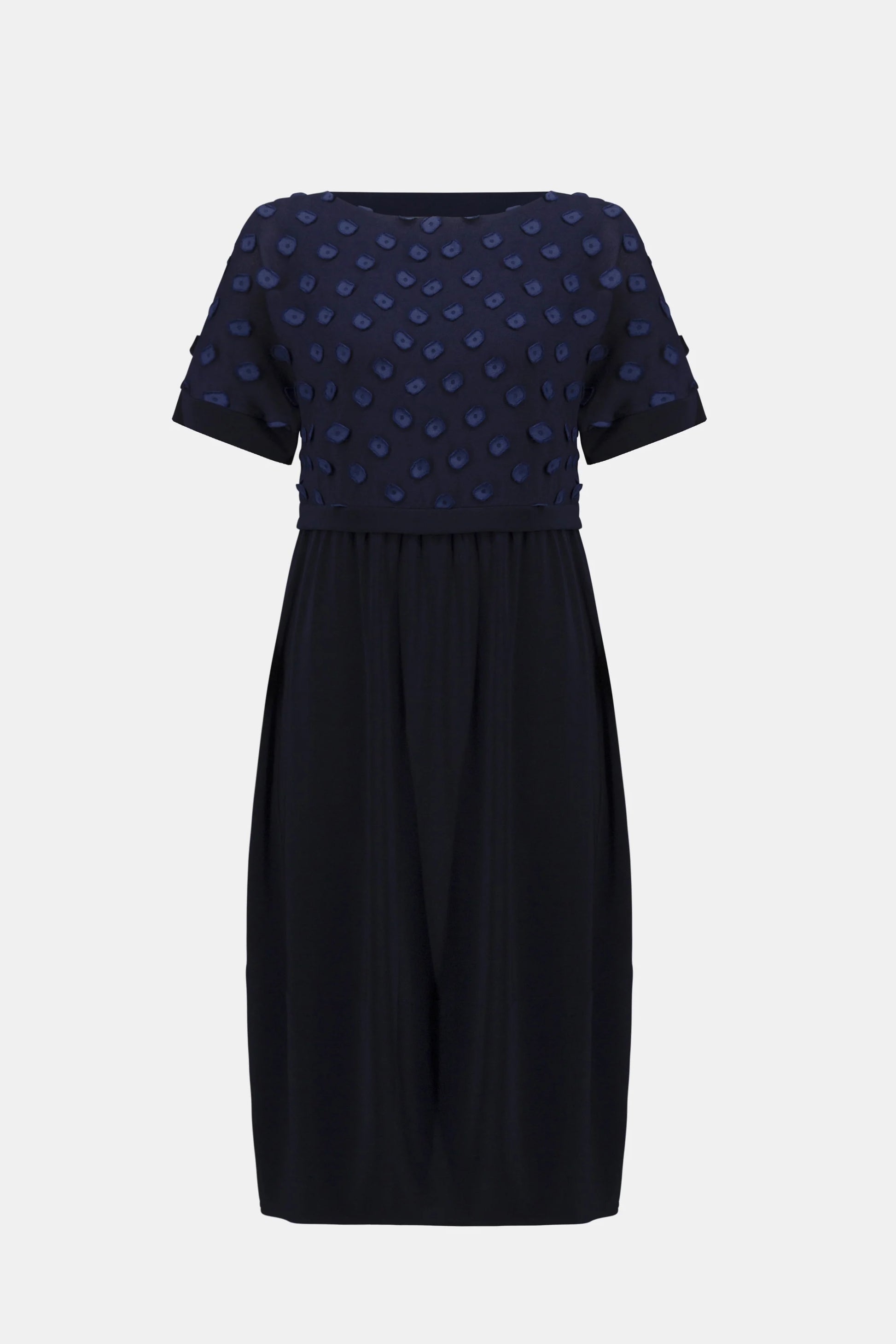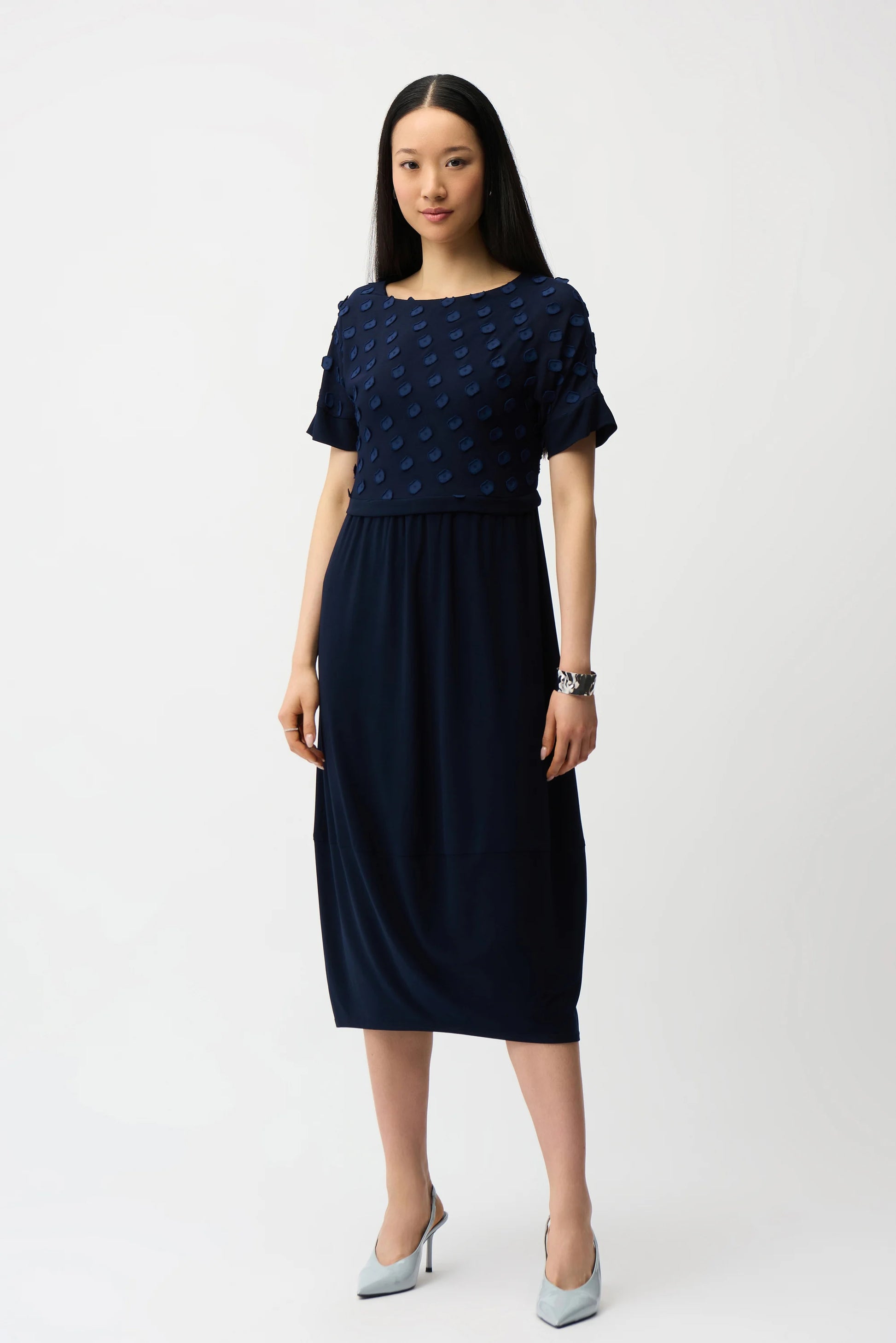 Soft structure meets playful texture in this silky knit cocoon dress, detailed with woven 3D dots, a boat neckline, and cuffed dolman sleeves. Shirring at the empire waist adds a flattering shape, while the partially lined design keeps it light.